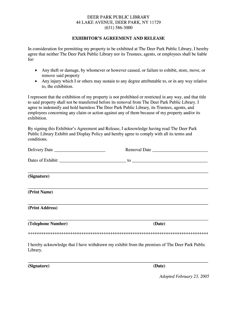 DEER PARK PUBLIC LIBRARY 44 LAKE AVENUE, DEER PARK, NY 11729 (631) 5863000 EXHIBITORS AGREEMENT AND RELEASE In consideration for permitting my property to be exhibited at The Deer Park Public Library,