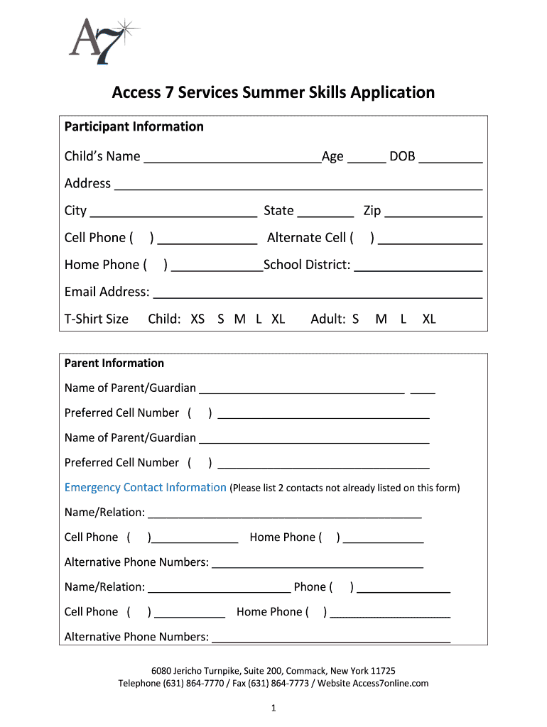 Access 7 Services Summer Skills Application Participant Information Child's Name AgeDOBAddress CityStateCell Phone ()Home Phone (Alternate Cell ()) School District:Email Address: Shirt Stepchild: