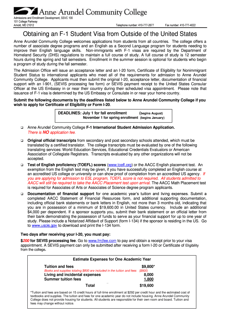The F-1 International Student Admission Application is a college application form used by Anne Arundel Community College to process applications from international students seeking to study in the United States.