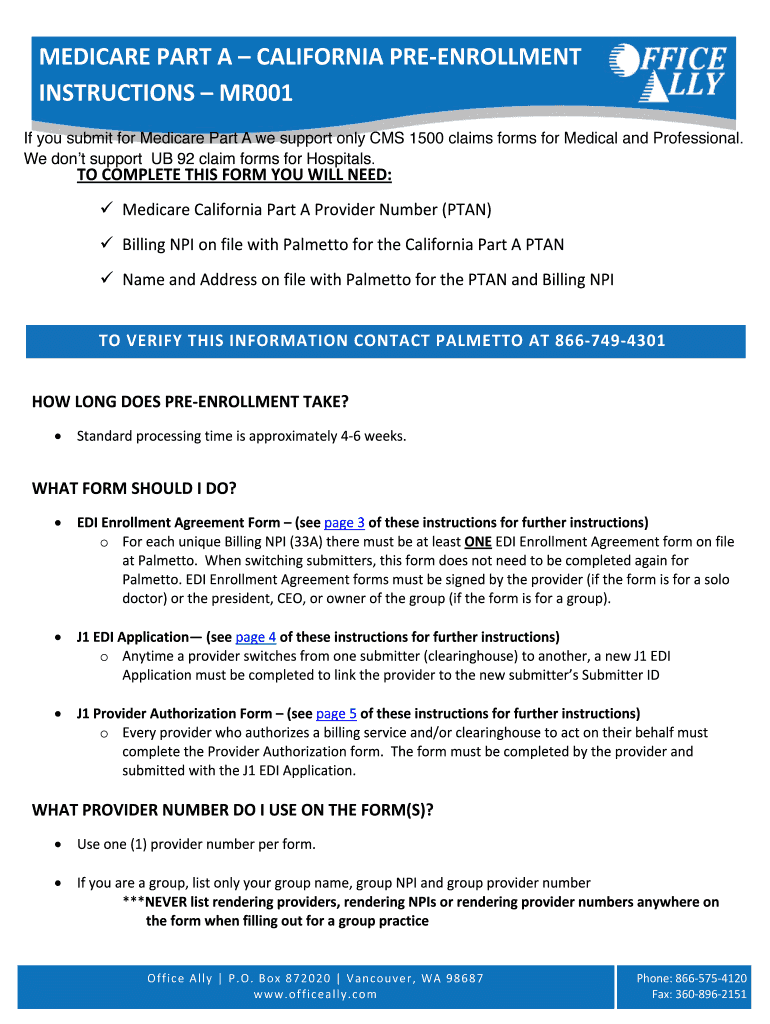 MEDICARE PART A CALIFORNIA PRE?ENROLLMENT INSTRUCTIONS MR001 If you submit for Medicare Part A we support only CMS 1500 claims forms for Medical and Professional. Don't support UP 92 claim forms for