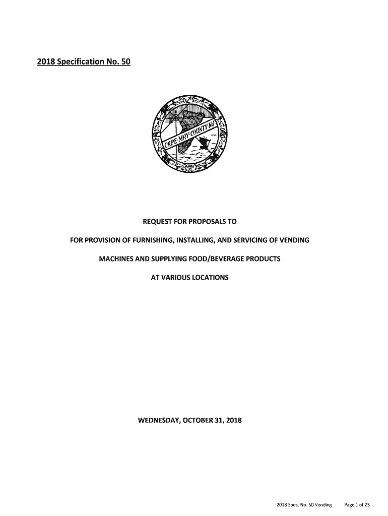 2018 Specification No. 50REQUEST FOR PROPOSALS TO FOR PROVISION OF FURNISHING, INSTALLING, AND SERVICING OF VENDING MACHINES AND SUPPLYING FOOD/BEVERAGE PRODUCTS AT VARIOUS LOCATIONSWEDNESDAY, OCTOBER