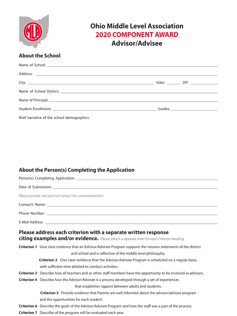 Ohio Middle Level Association 2020 COMPONENT AWARD Advisor/Advisee Component Award Description Schools that embrace an Advisor/Advisee model in order to provide adult advocacy for all middle level
