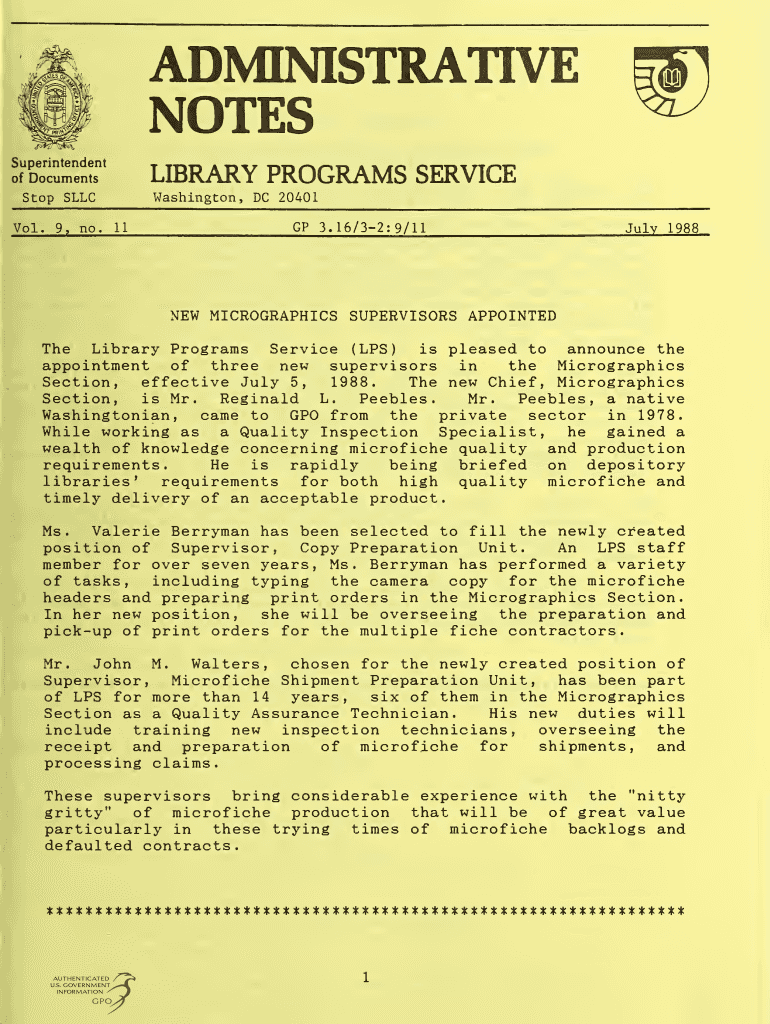 GP 3.16/32:9/1111July 1988NEW MICROGRAPH ICS SUPERVISORS APPOINTED