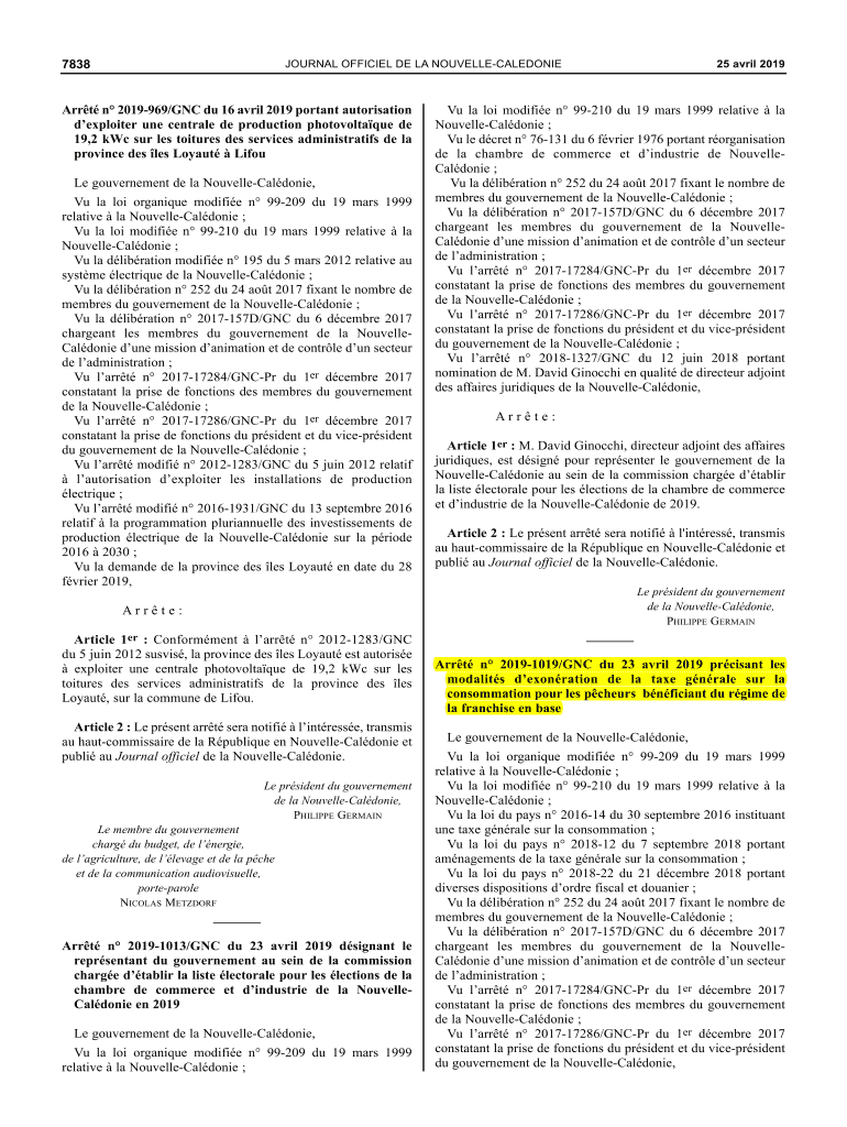 JOURNAL OFFICIAL DE LA NOUVELLECALEDONIE7838Arrt n 2019969/GNC Du 16 April 2019 portent authorization exploiter one central DE production photovoltaic DE 19,2 KWC SUR LES tortures DES services administration
