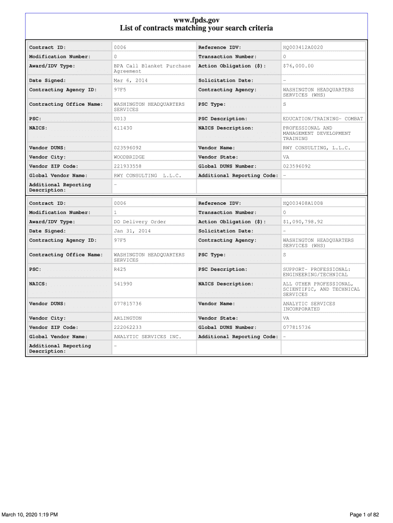 Contract ID:0006Reference ID:HQ003412A0020Modification Number:0Transaction Number:0Award/ID Type:BPA Call Blanket Purchase
