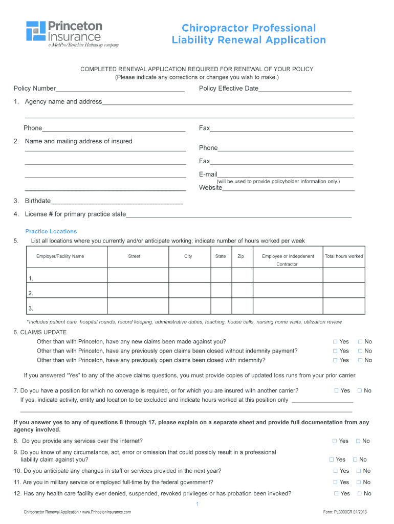 This form must be completed by chiropractors looking to maintain their professional liability insurance coverage with Princeton Insurance.