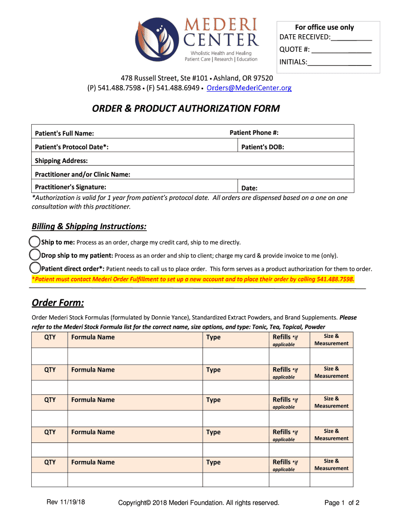 For office use only DATE RECEIVED: QUOTE #: INITIALS: 478 Russell Street, Ste #101 Ashland, OR 97520 (P) 541.488.7598 (F) 541.488.6949 Orders MederiCenter. Reorder & PRODUCT AUTHORIZATION FORM Patient