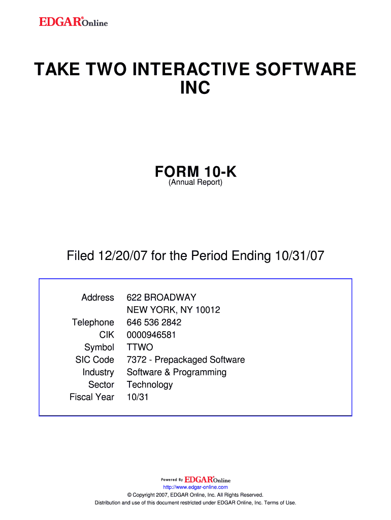 TAKE TWO INTERACTIVE SOFTWARE INFORM 10K (Annual Report)Filed 12/20/07 for the Period Ending 10/31/07 Address Telephone CIK Symbol SIC Code Industry Sector Fiscal Year622 BROADWAY NEW YORK, NY 10012
