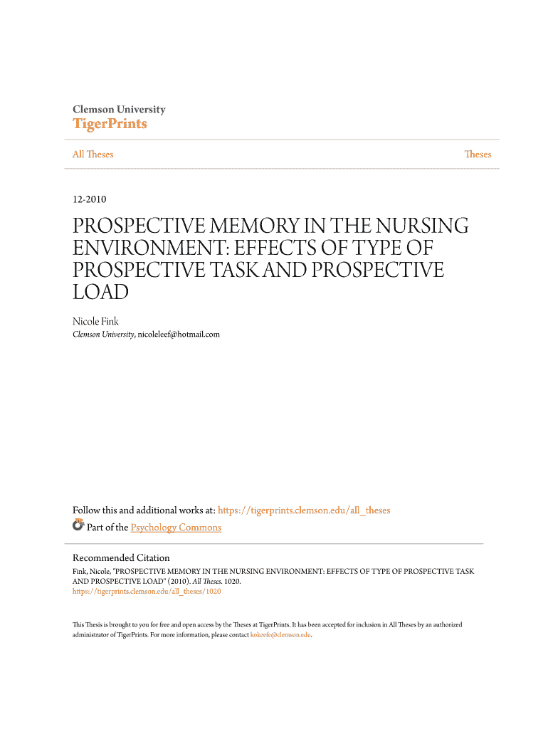 Clemson UniversityTigerPrints All ThesesTheses122010PROSPECTIVE MEMORY IN THE NURSING ENVIRONMENT: EFFECTS OF TYPE OF PROSPECTIVE TASK AND PROSPECTIVE LOAD Nicole Fink Clemson University, nicoleleef
