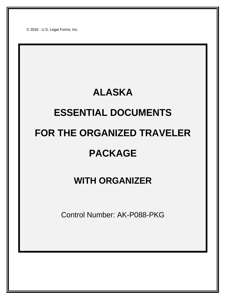 2016 U.S. Legal Forms, Inc.ALASKAESSENTIAL DOCUMENTS FOR THE ORGANIZED TRAVELERPACKAGEWITH ORGANIZERControl Number: AKP088PKGU. S. Legal Forms? Thank you for your purchase of a Personal Planning Package.