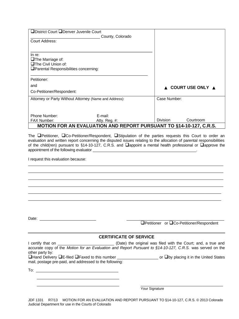 The Motion for Evaluation and Report, defined under §14-10-127, C.R.S., is a pivotal legal document in Colorado family law. This motion requests a court-ordered evaluation related to parental responsibilities, which is often essential in custody proceedings. The importance of court-ordered evaluations cannot be overstated, as they serve to provide impartial, professional assessments that aid in custody decisions.
