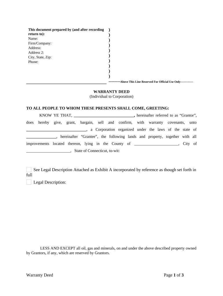 This Warranty Deed from Individual to Corporation form is a Warranty Deed where the grantor is an individual and the grantee is a corporation. Grantor conveys and warrants the described property to