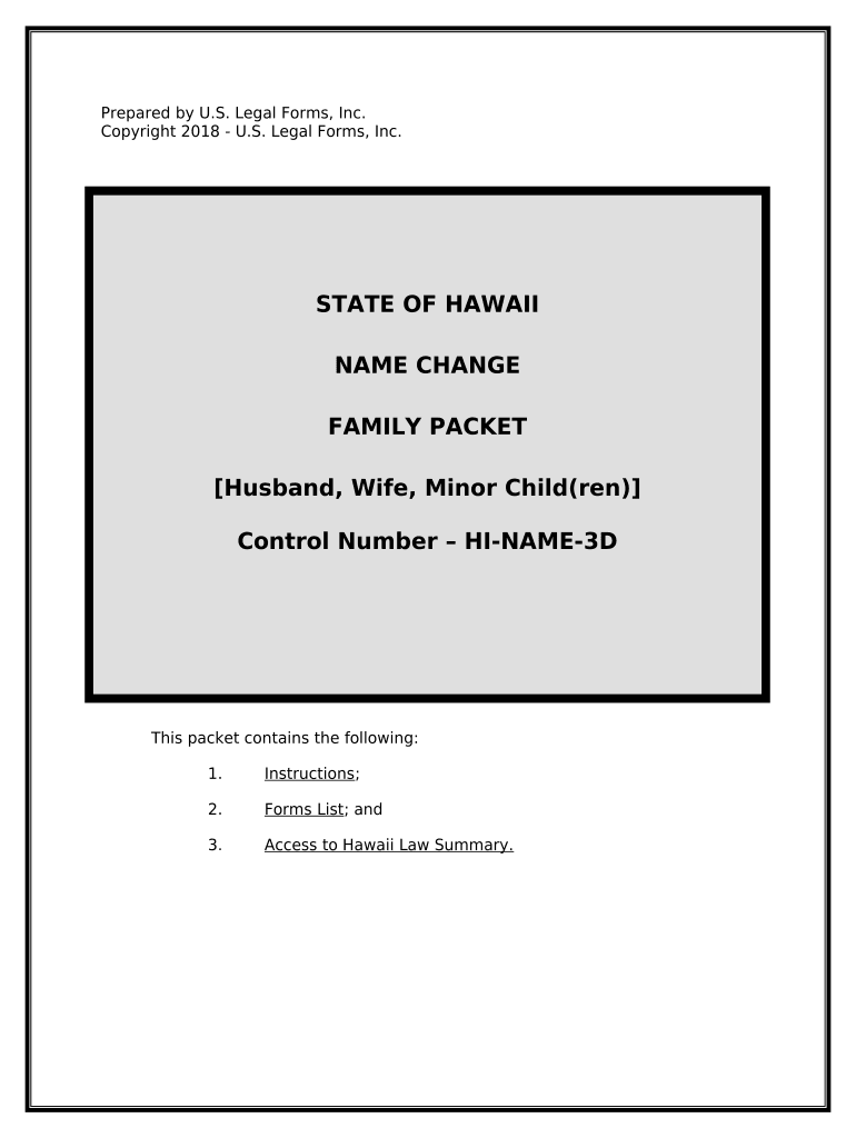 This is a Name Change package for a family, consisting of the father, mother and one or more minor childeren, for the state of Hawaii. This package contains (1) State Specific Information on change