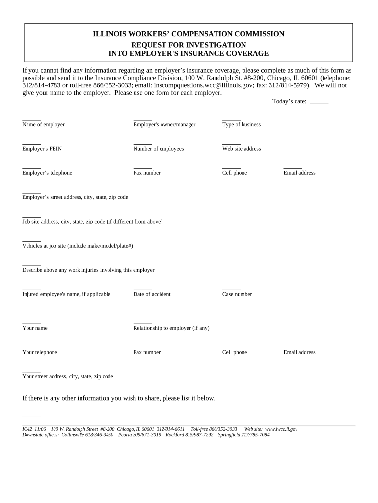 Illinois Workers Compensation CommissionRequest for investigation into Employer's insurance Coverage you cannot find any information regarding an employer's insurance coverage, please complete as