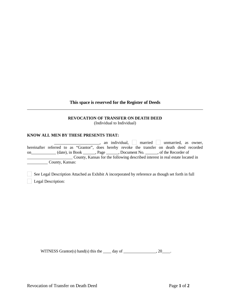 To fill out a revocation of transfer on death deed form, begin by identifying the original deed you wish to revoke. Gather necessary personal and property information and ensure compliance with your state's laws, such as those pertaining to Kansas. After correctly completing the form, it must be notarized and filed with the Register of Deeds.