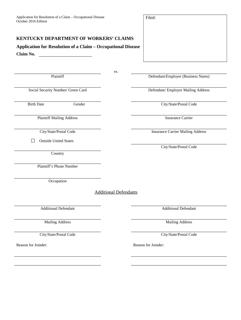 Application for Resolution of a Claim Occupational Disease October 2016 Edition Filed:KENTUCKY DEPARTMENT OF WORKERS CLAIMSApplication for Resolution of a Claim Occupational DiseaseClaim No.vs. PlaintiffDefendant/Employer