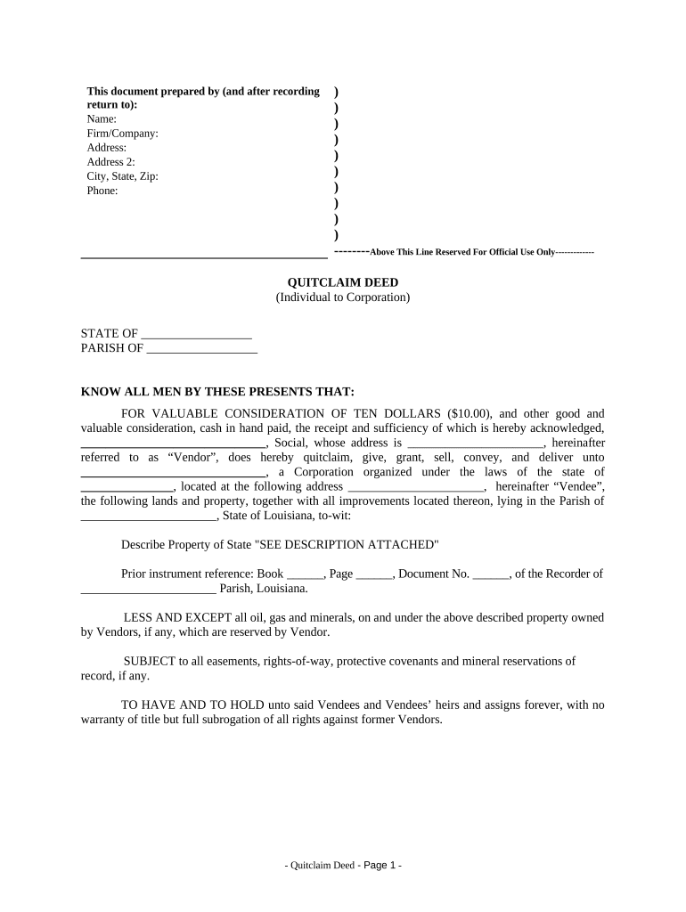 This Quitclaim Deed From an Individual To a Corporation form is a Quitclaim Deed where the grantor is an individual and the grantee is a corporation. Grantor conveys and quitclaims the described property