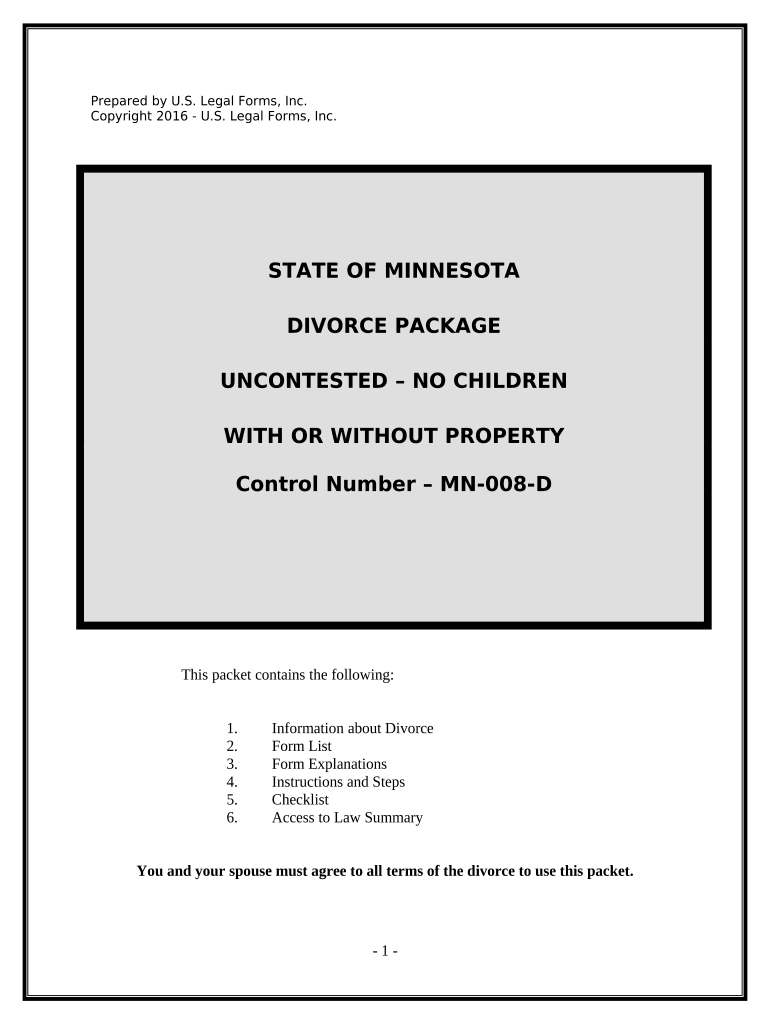 This No-Fault Agreed Uncontested Divorce Package specifically designed for Persons without Children and with or without Property and/or Debts includes (1) Information about Divorce, (2) Forms List,