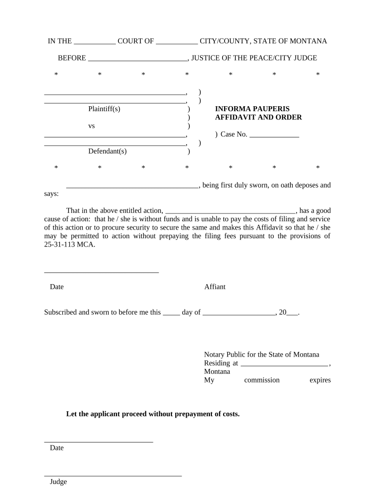 IN THE COURT OF CITY/COUNTY, STATE OF MONTANABEFORE, JUSTICE OF THE PEACE/CITY JUDGE* * * * * * *, ),)Plaintiff(s)) INFORM PAUPERS) AFFIDAVIT AND Orders), ) Case No. , )Defendant(s))* * * * * * *,