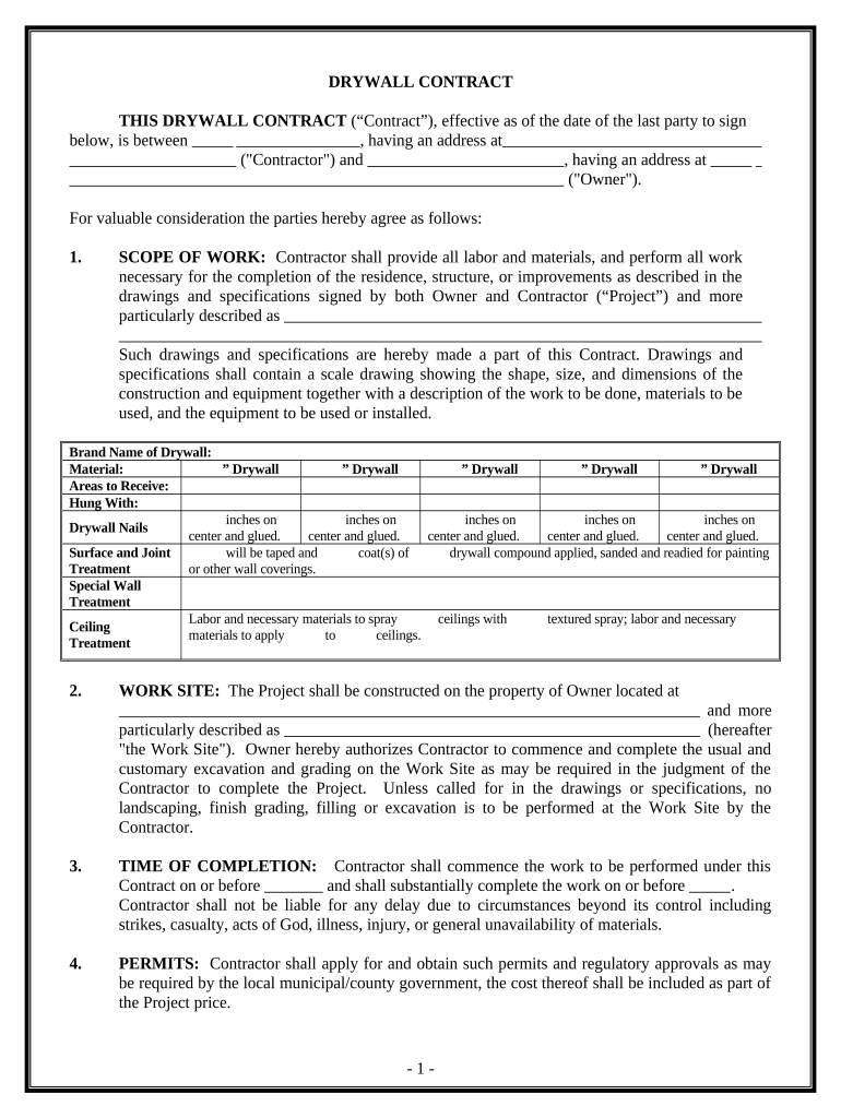 This form is designed for use between Sheetrock or Drywall Contractors and Property Owners and may be executed with either a cost plus or fixed fee payment arrangement. This contract addresses such