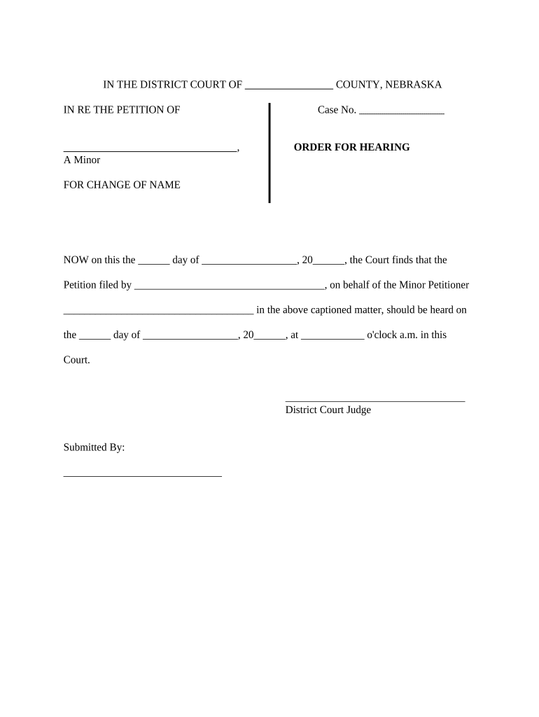 IN THE DISTRICT COURT OF COUNTY, NEBRASKAN RE THE PETITION OF, A Minor CHANGE OF NAME Case No. ORDER FOR HEARING NOW on this the day of, 20, the Court finds that the Petition filed by, on behalf of