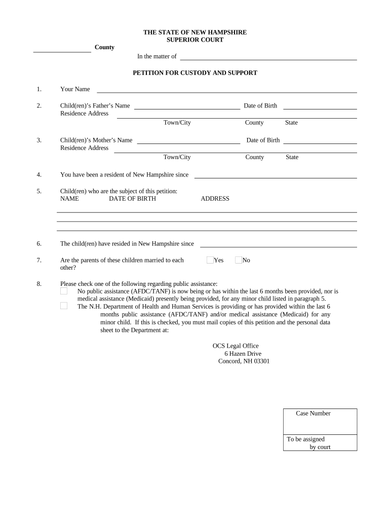 THE STATE OF NEW HAMPSHIRE SUPERIOR COURTCountyIn the matter competition FOR CUSTODY AND SUPPORT1. Your Name2. Child(men) is Father's Name Date of BirthResidence AddressTown/CityCountyState3. Child(men)