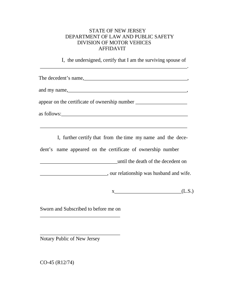 STATE OF NEW JERSEYDEPARTMENT OF LAW AND PUBLIC SAFETYDIVISION OF MOTOR VEHICESAFFIDAVITI, the undersigned, certify that I am the surviving spouse of. The decedents name, and my name, appear on the