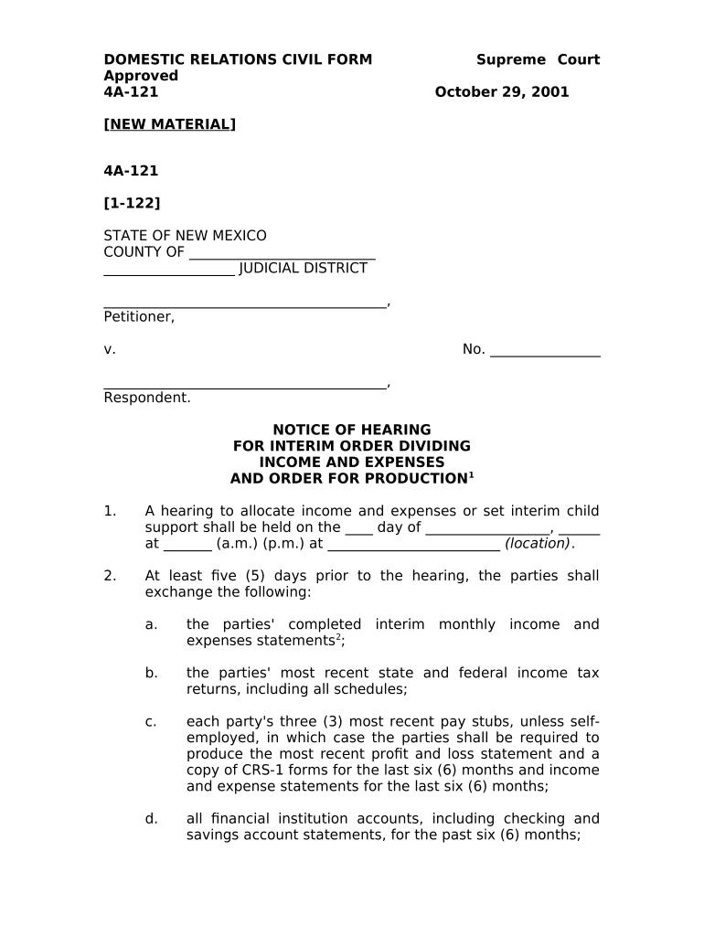 4A121 1122 STATE OF NEW MEXICO COUNTY OF JUDICIAL DISTRICT, Petitioner, v. No. , Respondent. NOTICE OF HEARING INTERIM ORDER DIVIDINGINCOME AND EXPENSES AND ORDER FOR PRODUCTION11. A hearing to allocate