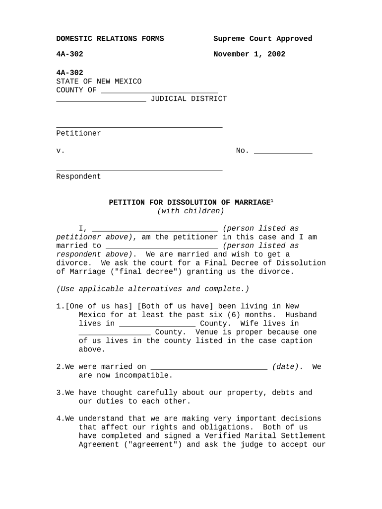 4A302 STATE OF NEW MEXICO COUNTY OF JUDICIAL DISTRICT Petitioner. No. RespondentPETITION FOR DISSOLUTION OF MARRIAGE1(with children)I, (person listed as petitioner above), am the petitioner in this