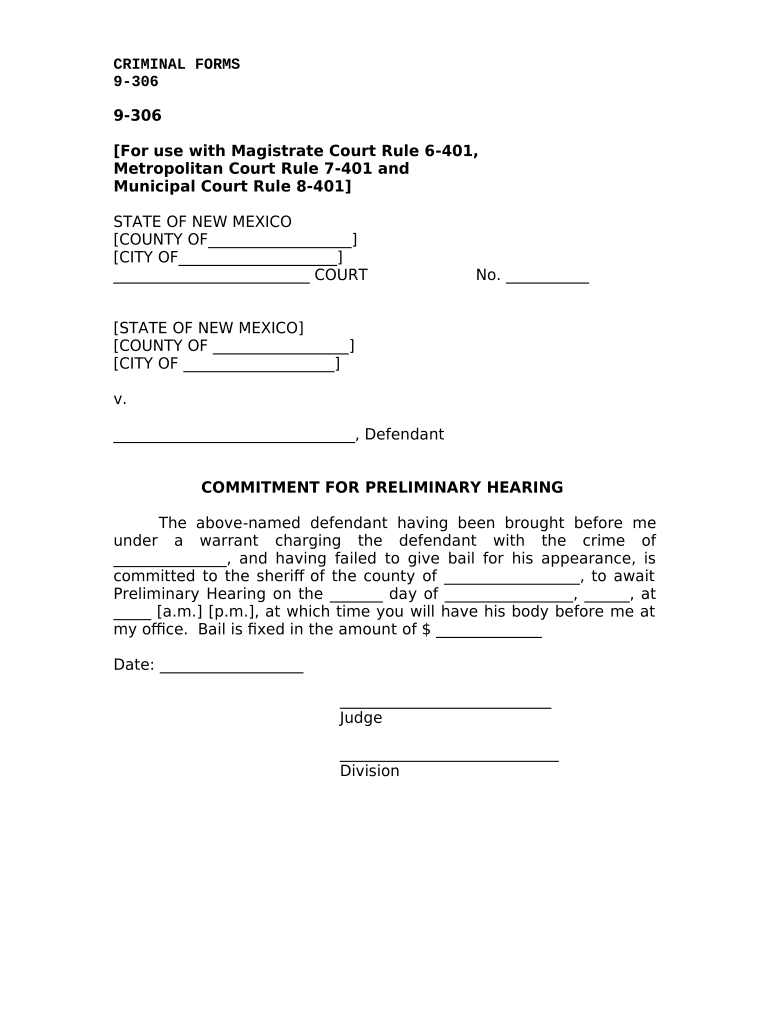 CRIMINAL FORMS 9-306 For use with Magistrate Court Rule 6-401 Metropolitan Court Rule 7-401 and Municipal Court Rule 8-401 STATE OF NEW MEXICO COUNTY OF CITY OF COURT No. v. COMMITMENT FOR PRELIMINARY HEARING The above-named defendant having been brought before me under a warrant charging the defendant with the crime of committed to the sherif of the county of to await Preliminary Hearing on the day of at a.m. p.m. at which time you will have his body before me at my ofce.