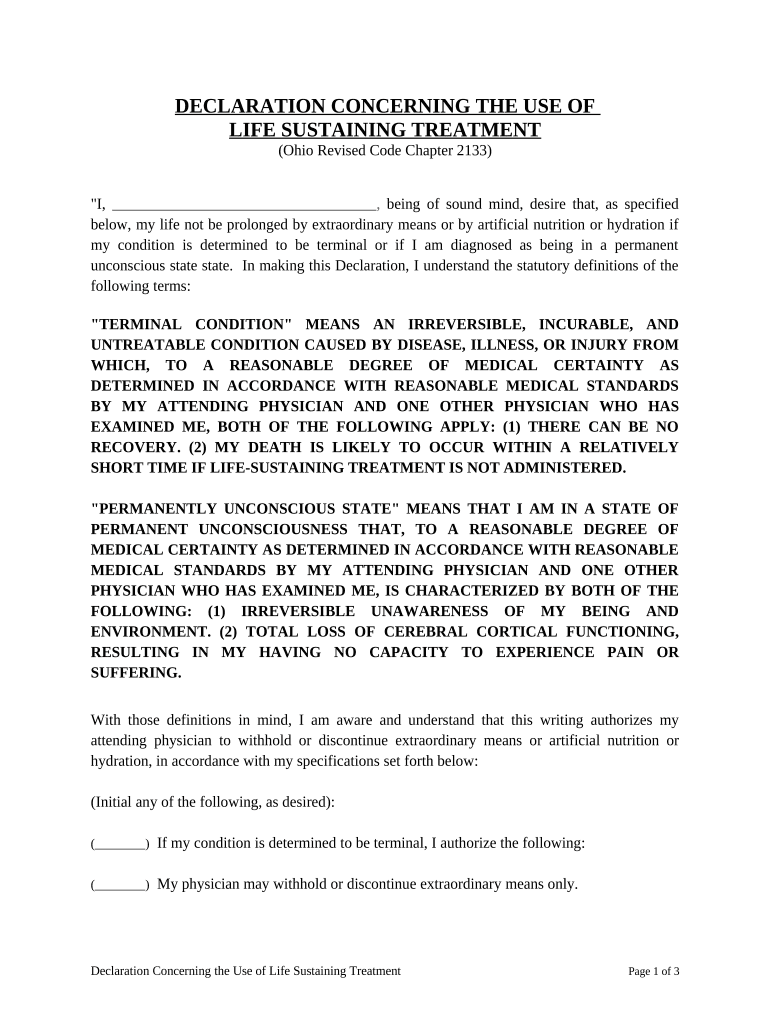 This form is a Declaration Concerning the Use of Life Sustaining Treatment. The declaration must be witnessed by two people or acknowledged by the declarant before a notary public.