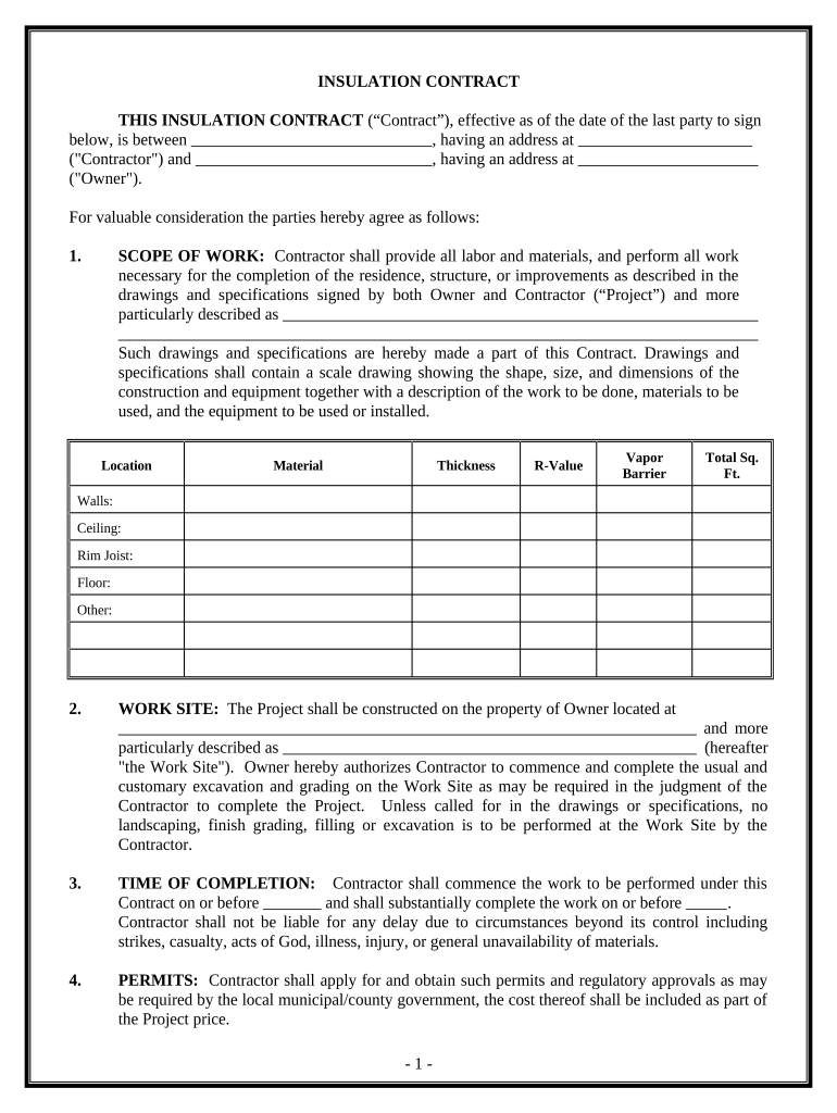 An insulation contract includes fundamental sections that outline the scope of work, project specifications, and the work site details. Each of these components ensures that both parties have a clear understanding of the project expectations and requirements.