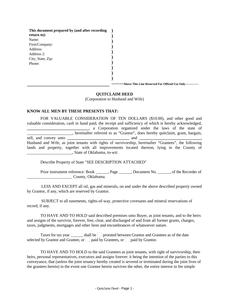 This Quitclaim Deed from Corporation to Husband and Wife form is a Quitclaim Deed where the Grantor is a corporation and the Grantees are husband and wife. Grantor conveys and quitclaims the described