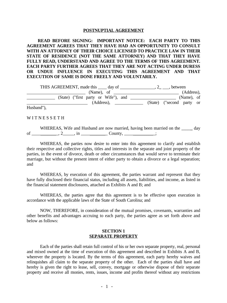 This Postnuptial Property Agreement is made with the intent to define and specify the respective and collective rights of the parties in the separate and joint property of the parties. The parties