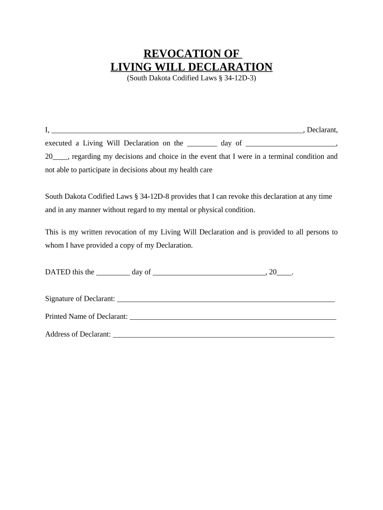 Any individual who has previously executed a Living Will in South Dakota and wishes to revoke it is eligible to use this form.