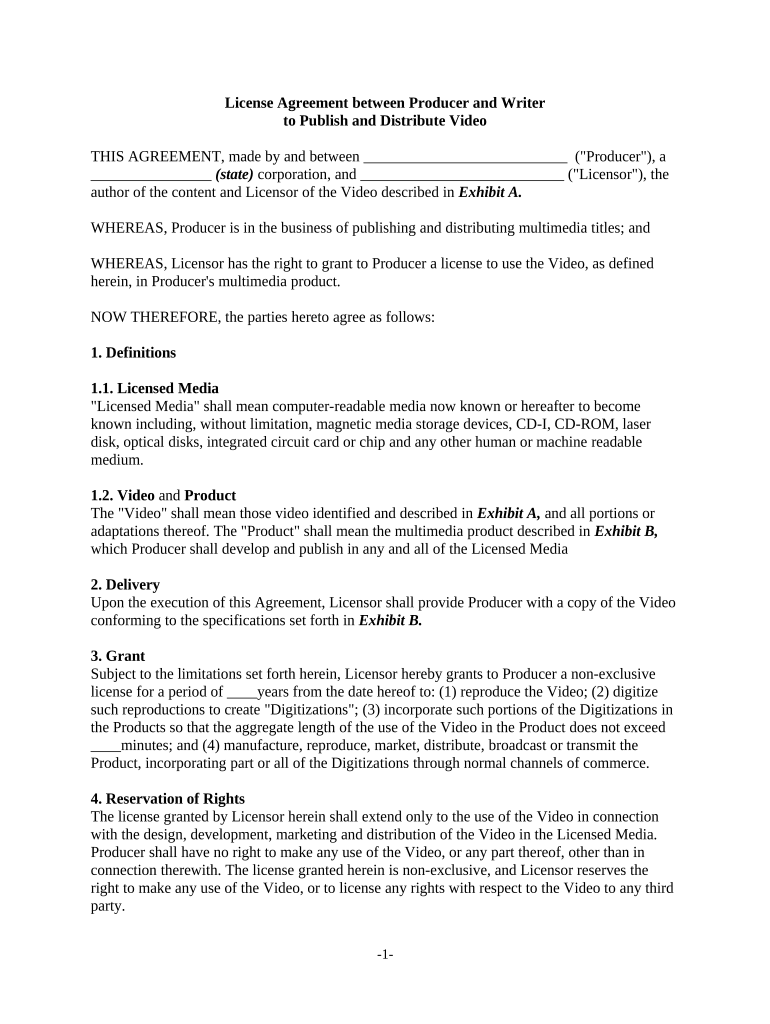 A license agreement is a legal document that outlines the permissions granted by one party (the Licensor) to another (the Licensee) to use specified intellectual property. In the context of a license agreement between producer and writer, it primarily covers the rights to publish and distribute video content. Understanding these agreements is essential for both parties to avoid potential disputes.