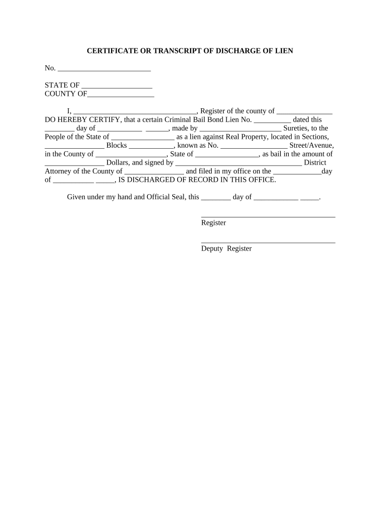 This form is a Notice of Satisfaction of Bail Bond Lien on Real Estate. To be filed by the lienholder when lien is satisfied. Adapt to fit your circumstances.