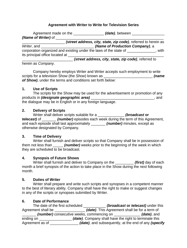 The Television Series Writer Agreement is a business document used by writers and production companies to establish the terms of script creation for a television series.