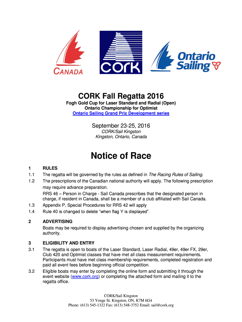 Get the free Notice of Race CORK Fall Regatta, Great Lakes Laser ...
