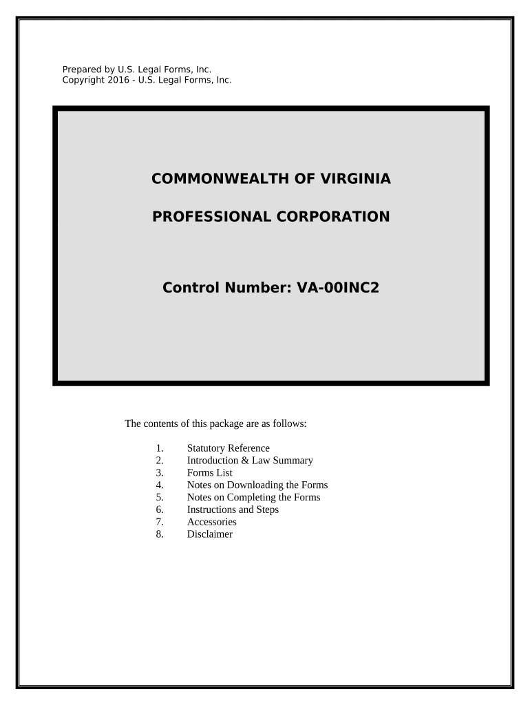 This form package provides the forms necessary to form a professional corporation for the practice of a state-licensed profession in Virginia. You fill in the name of your profession in the blanks