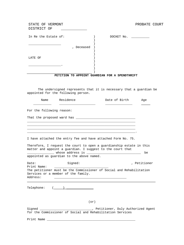 Get the free Vermont Petition to Appoint Guardian for a Spendthrift