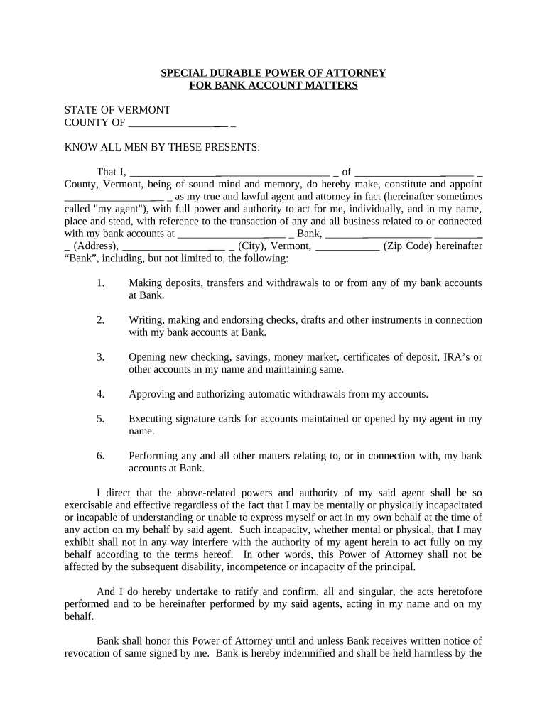 Special Durable Power of Attorney for Bank Account Matters in Vermont