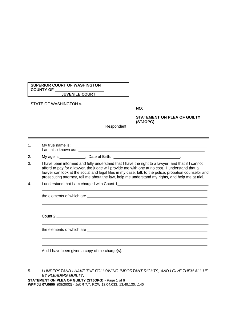 SUPERIOR COURT OF WASHINGTON COUNTY OF JUVENILE CORUSCATE OF WASHINGTON v. Respondent NO:STATEMENT ON PLEA OF GUILTY (STOP)1. My true name is: I am also known as: 2. My age is. Date of Birth:. 3.