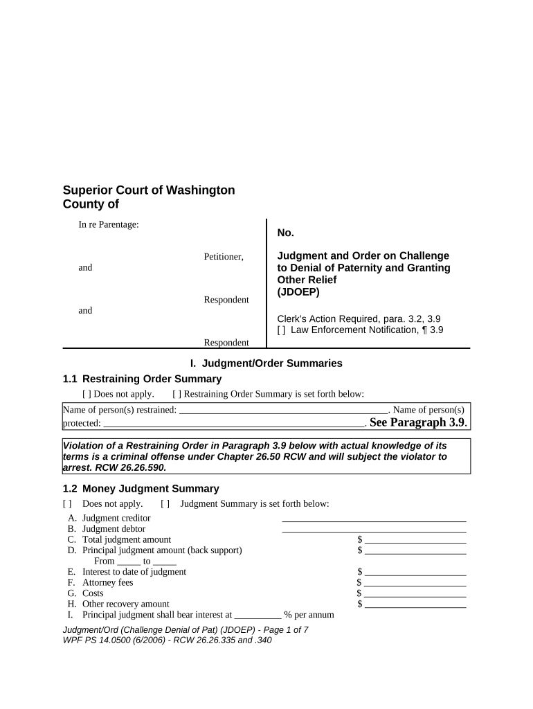 Superior Court of Washington County Odin re Parentage:Petitioner, correspondent andRespondentNo. Judgment and Order on Challenge to Denial of Paternity and Granting Other Relief (JD OEP)Clerk's Action