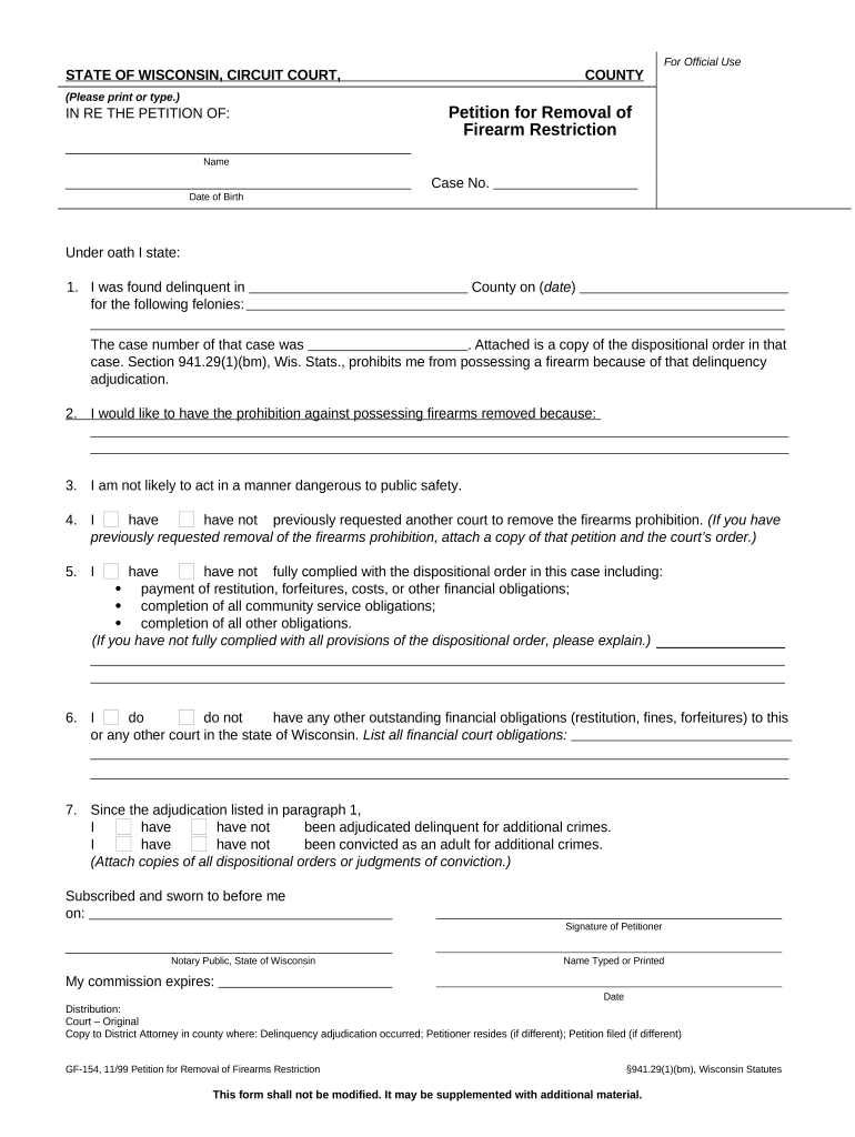 STATE OF WISCONSIN, CIRCUIT COURT, COUNTY For Official Use (Please print or type.) IN RE THE PETITION OF:Competition for Removal of Firearm RestrictionDate of Birth Case No. Under oath, I state:1.
