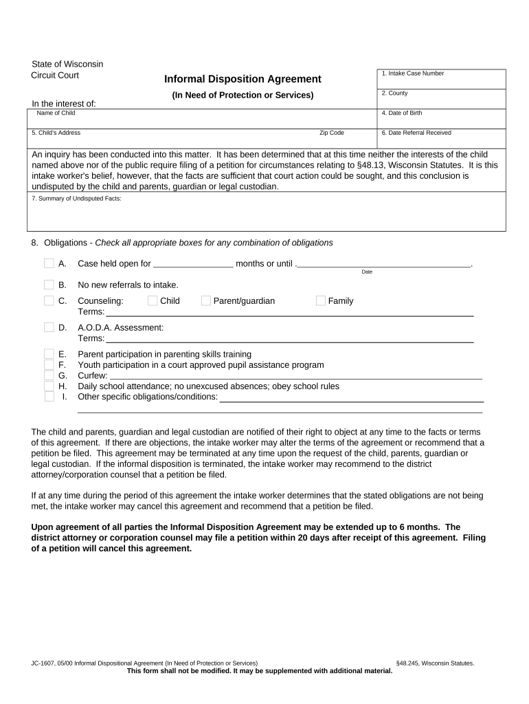 State of WisconsinCircuit Court Informal Disposition Agreement 1. Intake Case Number In the interest of: (In Need of Protection or Services) 2. County Name of Child 4. Date of Birth 5. Child's Address
