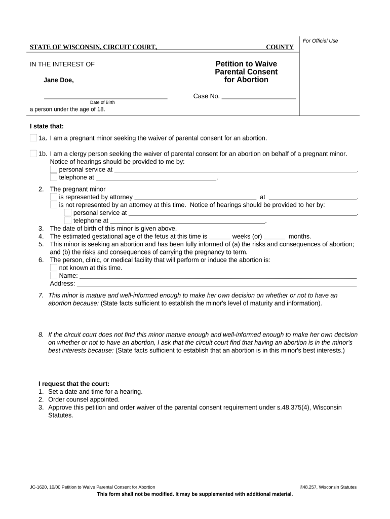 A petition to waive parental consent is a legal request made by a minor seeking the right to undergo an abortion without informing their parents. This process is particularly relevant in states like Wisconsin, where parental consent laws can restrict access to abortion services for minors.