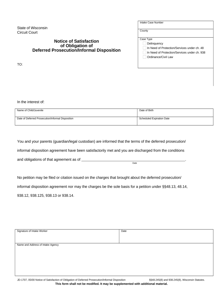 State of Wisconsin Circuit CourtNotice of Satisfaction of Obligation of Deferred Prosecution/Informal DispositionIntake Case Number County Case TypeDelinquencyIn Need of Protection/Services under