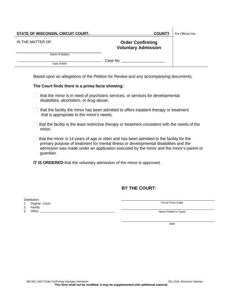 The Wisconsin Order Confirming Voluntary Admission is a crucial legal document that facilitates the admission of minors into psychiatric and developmental treatment facilities. This order ensures that the necessary legal process is followed, ultimately safeguarding the welfare of the minor. Its significance lies in the approval by the Wisconsin court, which validates the voluntary admission process, providing a structured pathway for mental health services. The form associated with this procedure is known as Wisconsin court form ME-922.