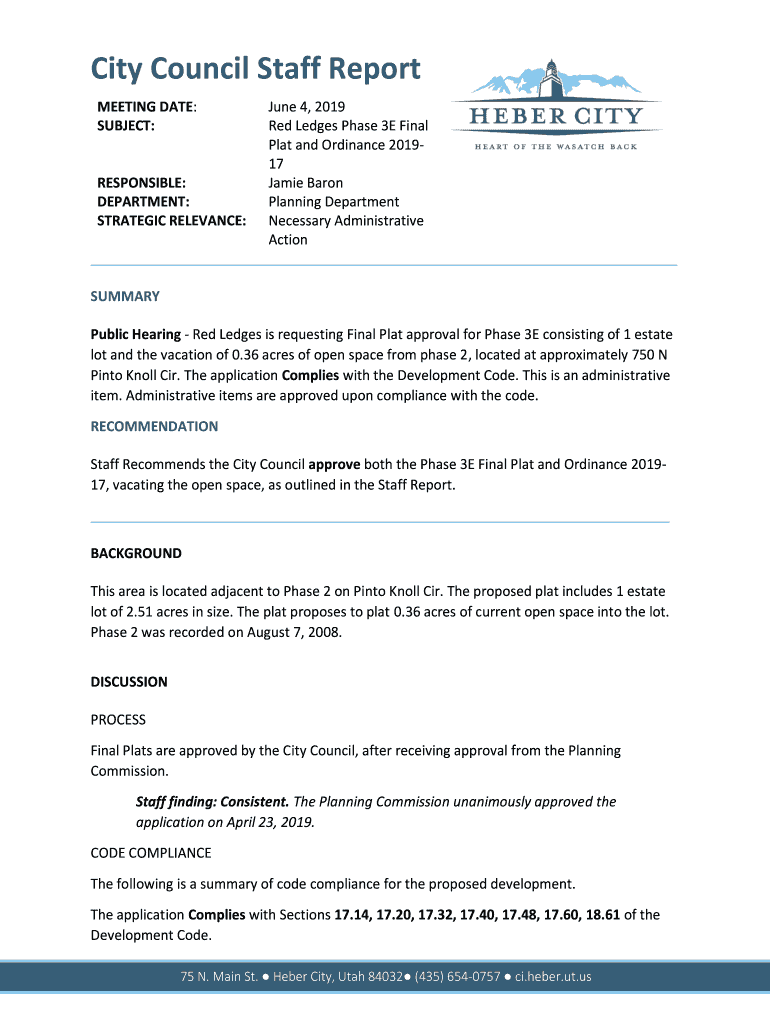 City Council Staff Report MEETING DATE: SUBJECT:June 4, 2019, Red Ledges Phase 3E Final Plat and Ordinance 201917 RESPONSIBLE: Jamie Baron DEPARTMENT: Planning Department STRATEGIC RELEVANCE: Necessary